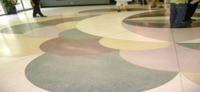 水磨石因其原材料來源豐富,價格較低,裝飾效果好,施工工藝簡單等優點,獲得較為廣泛的應用。水磨石也是一種人造石,用水泥做膠結料,摻入不同色彩,不同粒徑的大理石或花崗石碎石。經過攪拌、成型、養護、研磨等工序,制成一種具有一定裝飾效果的人造石材。